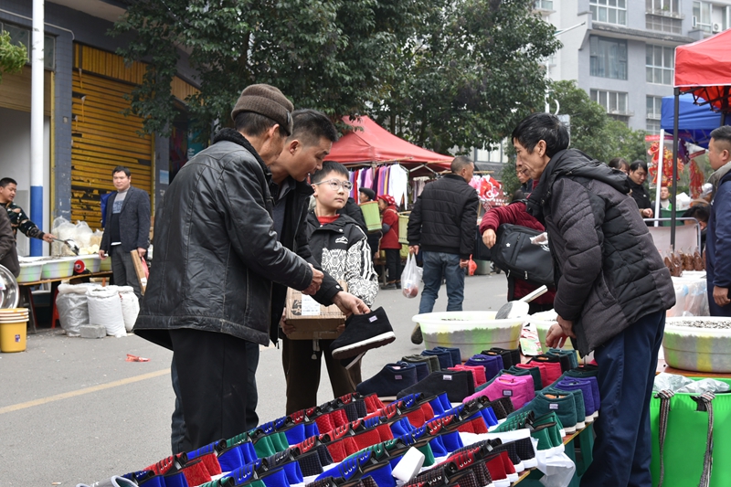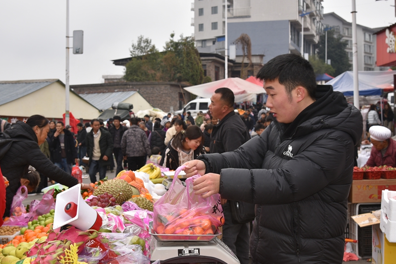 “隻有過年的時期,我才能回家與家人團聚。昨天才回到家,今天是趕場,就要買點瓜子、水果、糖果、食品配料等,隨便給父母買幾件衣服,快快樂樂過新年。”大岩村民方在平在市場挑選貨物時說。