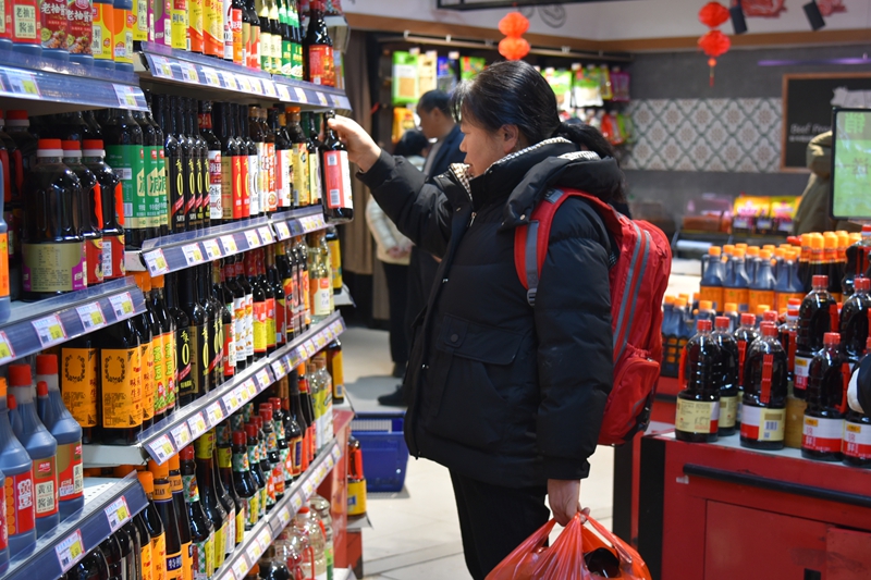 “老板,買2瓶醬油、2瓶香醋、1斤花椒面、1包味精。”新河村群眾孫洪軍拿著手裡的年貨單子,在農貿市場食品配料攤購買過年所需要的作料。