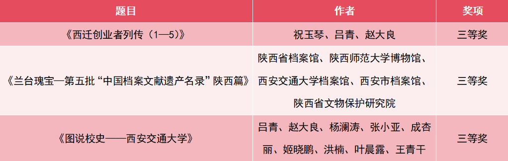 近日,陕西省档案学会2019-2024年度全省档案学优秀成果评选结果揭晓。经过专家严格评审,本次评选共产生64项获奖成果,其中论文类一等奖3项、二等奖7项、三等奖9项、优秀奖34项;‌著作类一等奖1项、二等奖3项、三等奖7项。西安交通大学档案馆凭借深厚的档案文化积淀以及创新的实践探索,在此次评选中获论文类二等奖1项、优秀奖2项,著作类三等奖3项,获奖总数位居全省高校档案馆首位。