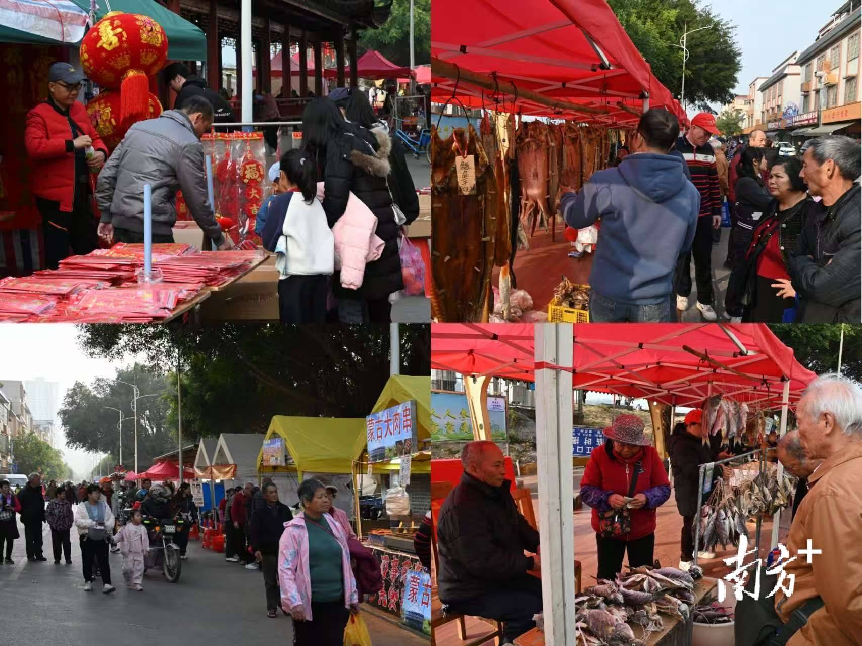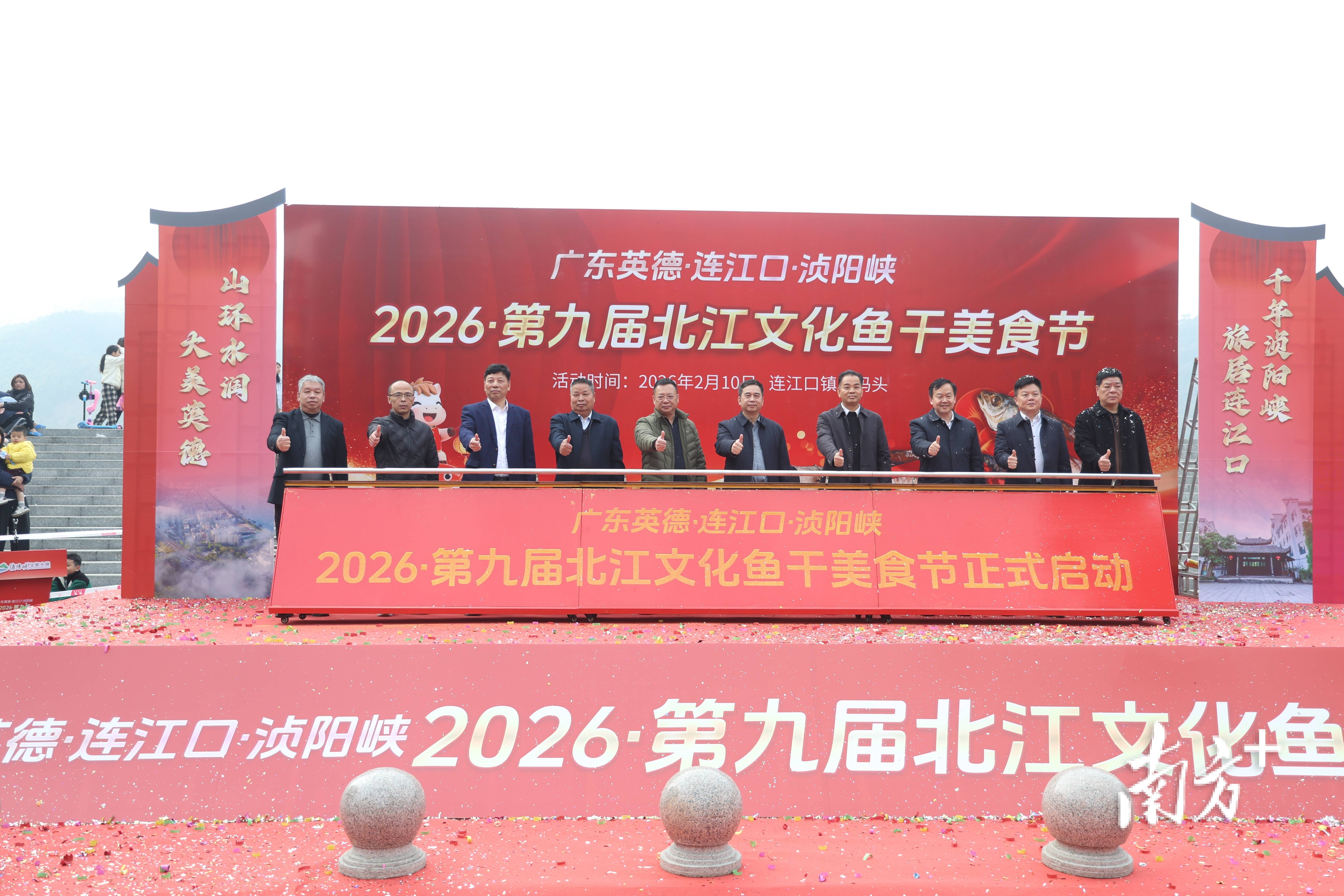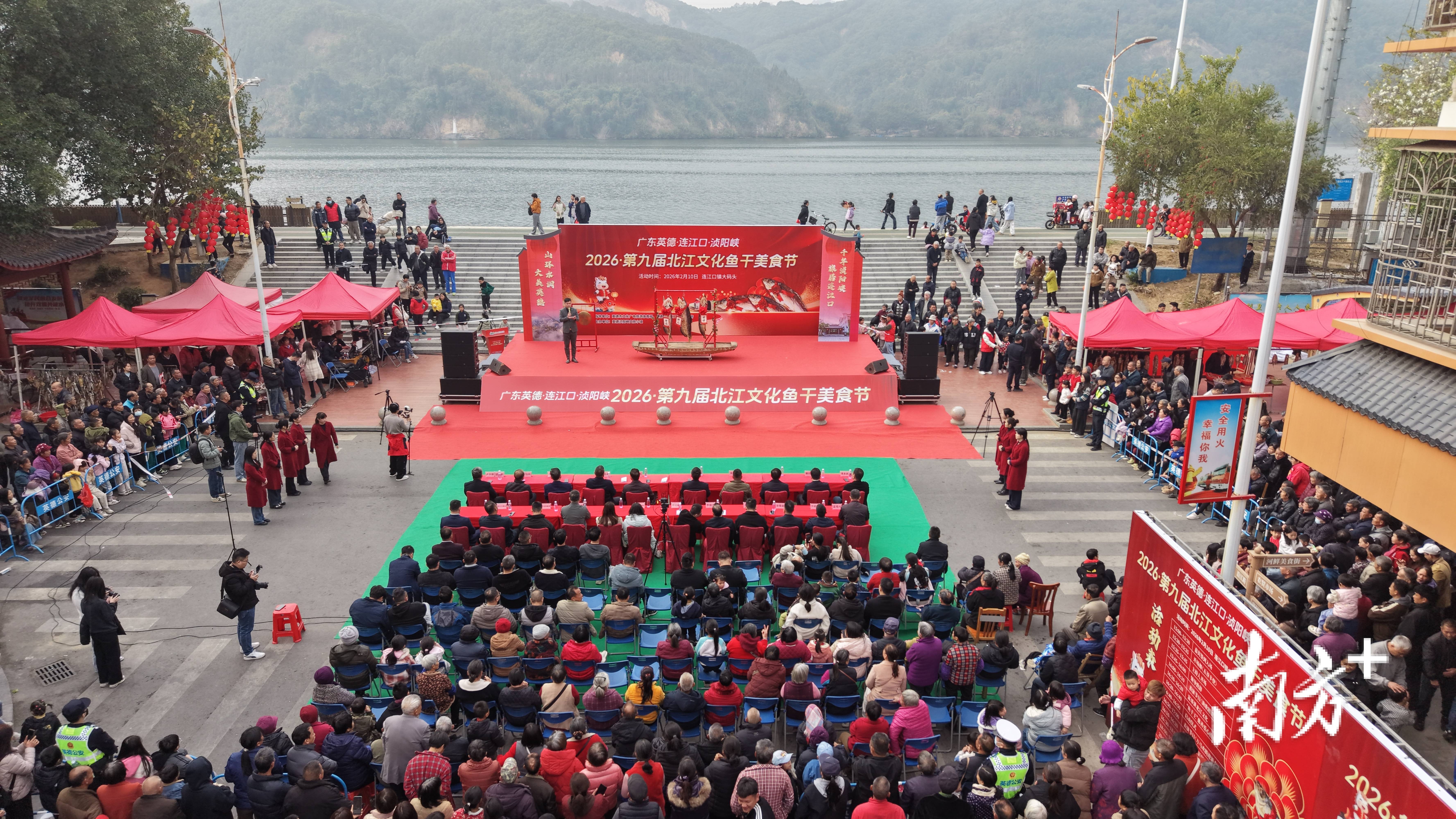 广东英德浈阳峡第九届北江文化鱼干美食节在连江口镇迎春花市启幕。连江口镇宣